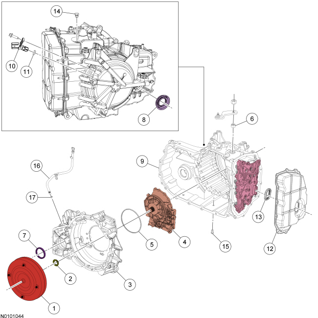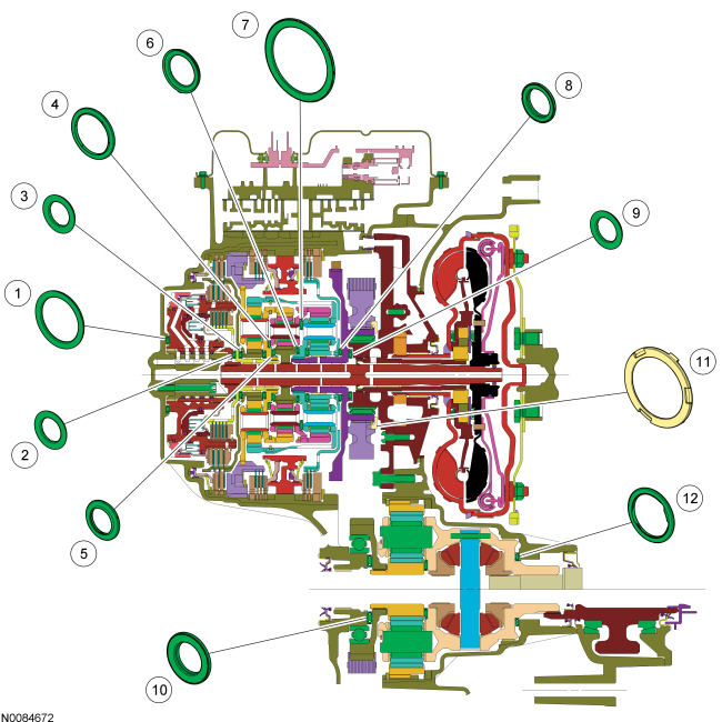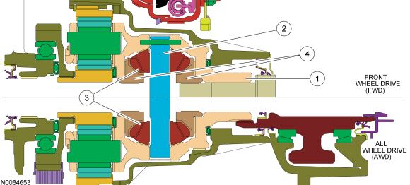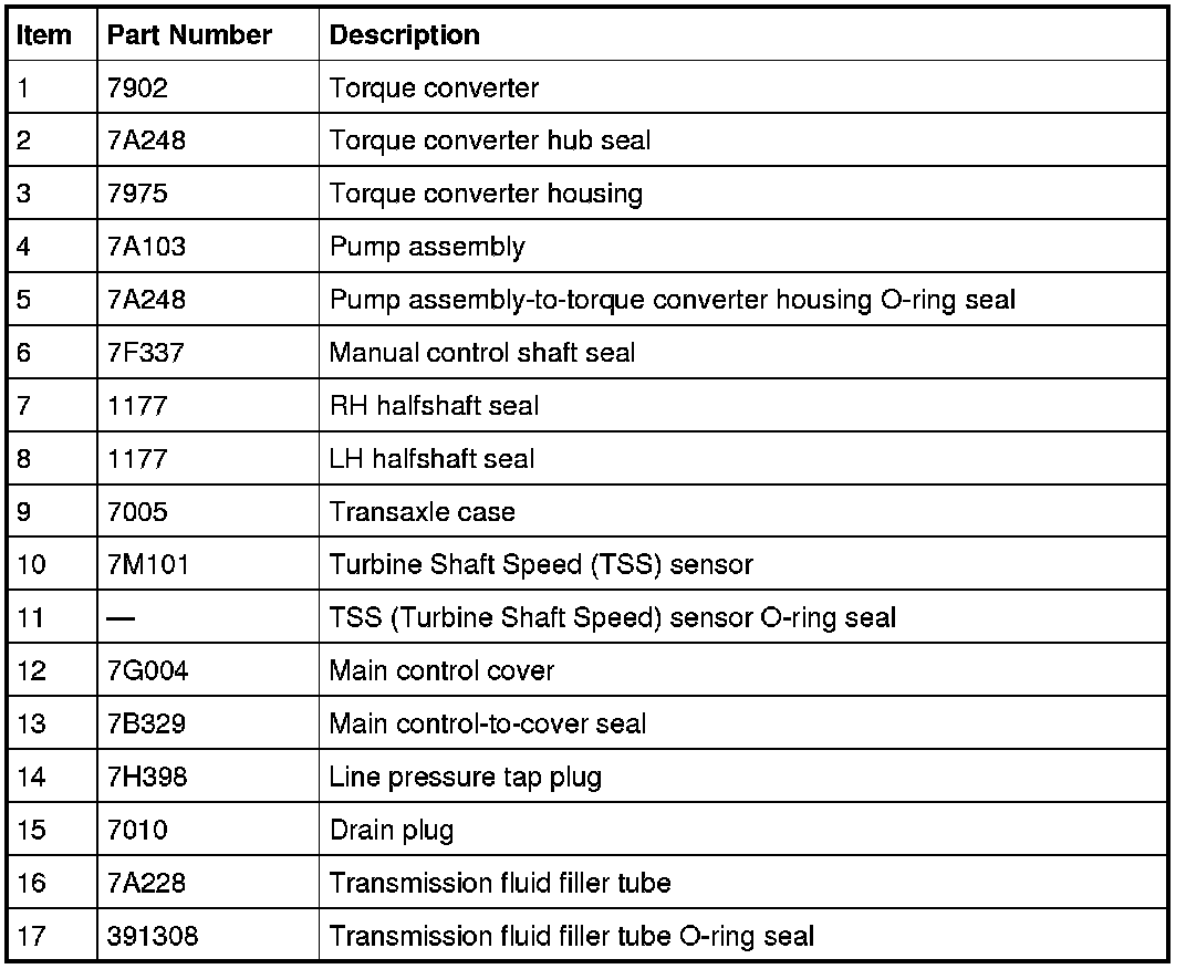 The torque converter housing has a lip-type seal that seals the torque converter hub. The pump assembly seals to the torque converter housing with a rubber seal. The manual shaft and halfshafts also use lip-type seals. All-Wheel Drive (AWD) vehicles do not use a RH halfshaft seal, the transaxle is sealed by the Power Transfer Unit (PTU) on the RH side.