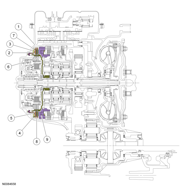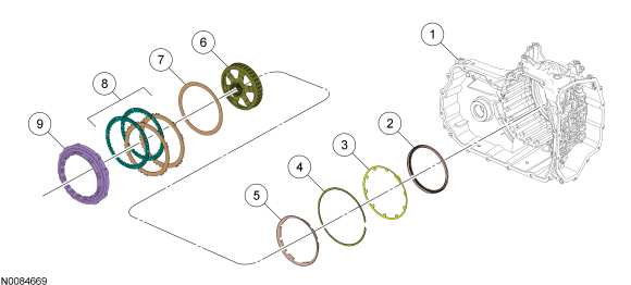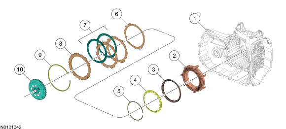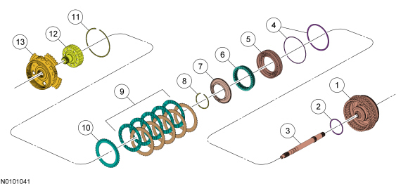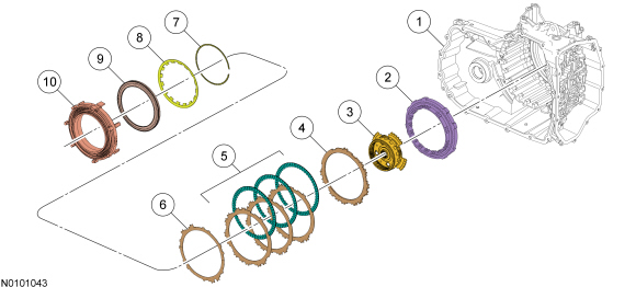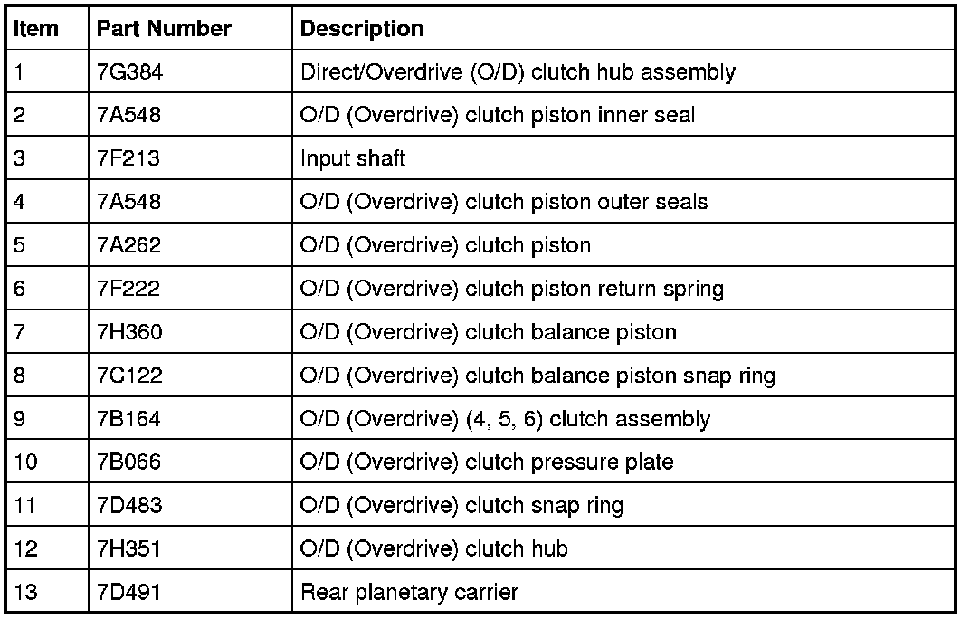 The O/D (Overdrive) clutch is a drive clutch that transfers power from the direct/O/D (Overdrive) clutch hub assembly to the rear planetary carrier. The O/D (Overdrive) clutch is applied in 4th, 5th and 6th gears.