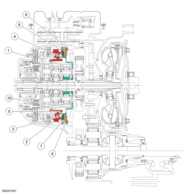 The transmission fluid in the input shaft circuit flows from the back of the input shaft toward the front of the input shaft and passes through ports in the input shaft to lubricate the planetary gearset, clutches, final drive assembly and other components of the transaxle.