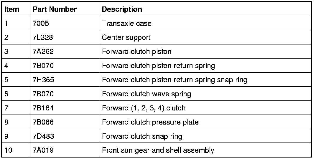 The forward clutch is a brake clutch that holds the front sun gear and shell assembly. The forward clutch is applied in 1st, 2nd, 3rd and 4th gears.