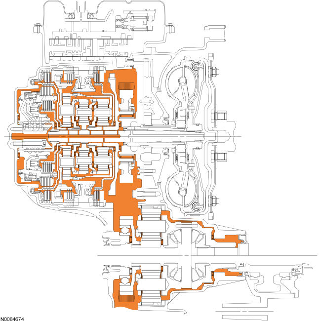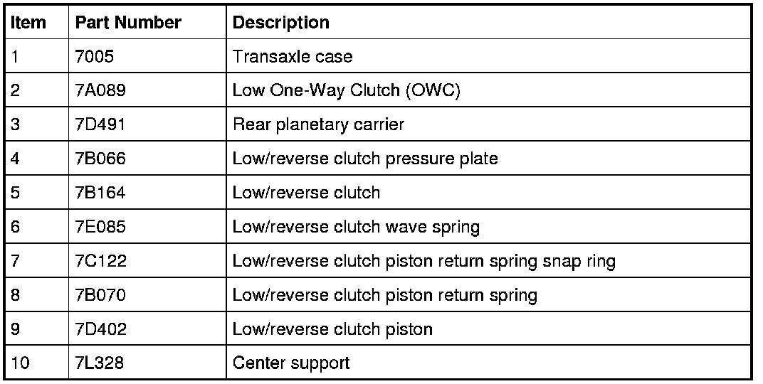 The low/reverse clutch is a brake clutch that holds the low OWC (One-Way Clutch) which is splined to the rear planetary carrier. The low/reverse clutch is applied in manual LOW, REVERSE and 1st gear up to 8 km/h (5 mph).