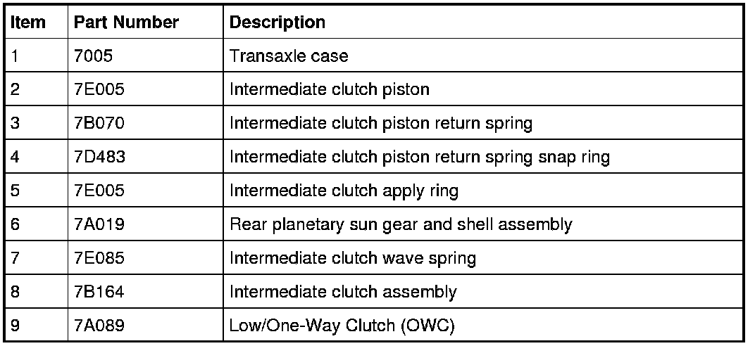 Hydraulic pressure from the regulator valve in the valve body pushes the intermediate clutch piston against the intermediate clutch pack to apply the clutch. The low OWC (One-Way Clutch) works as a pressure plate for the intermediate (2, 6) clutch. The rear planetary sun gear and shell assembly is held stationary to the transaxle case as a result of the clutch being applied.