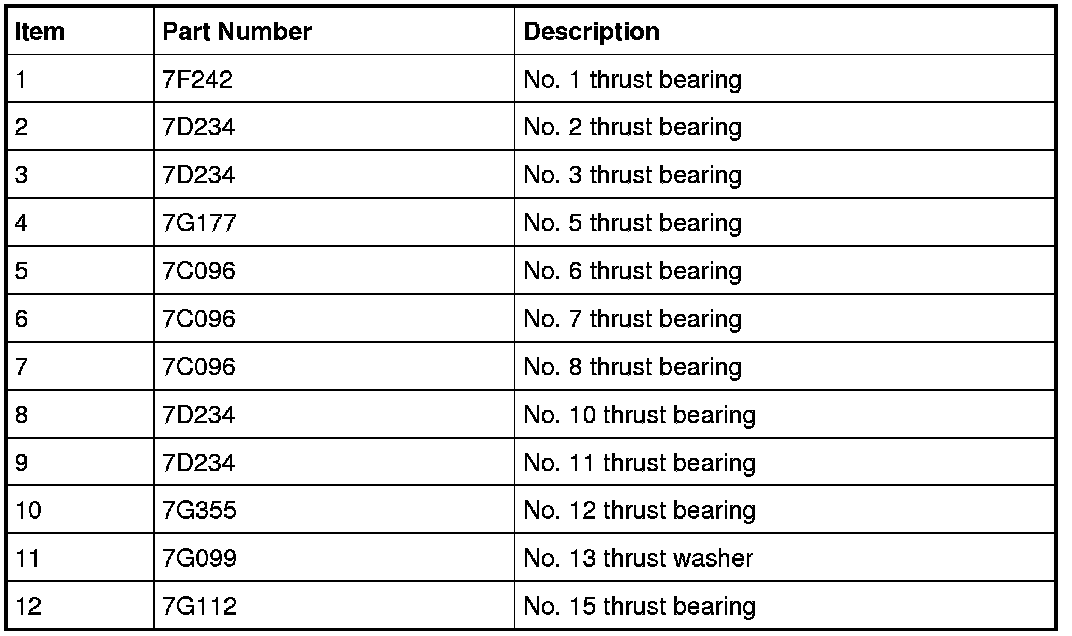 The No. 4 thrust bearing is part of the rear planetary carrier assembly. The No. 9 thrust bearing is part of the front planetary carrier assembly. The No. 14 thrust bearing is part of the differential assembly.