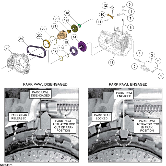 - The actuator rod pivots the park pawl into the lugs on the park gear, locking the gear stationary to the transaxle case.