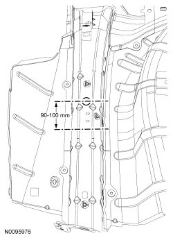 6. Locate the drain hole at the 4th convolute on the frame rail, measure and mark 90 mm (3.543 in) to 100 mm (3.937 in) rearward from the center of the drain hole and scribe a cut line.