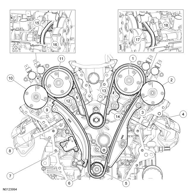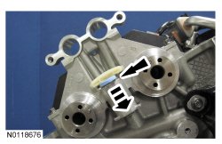 23. NOTE: The 2 VCT (Variable Camshaft Timing) oil control solenoids are removed for clarity.