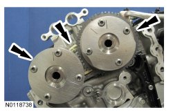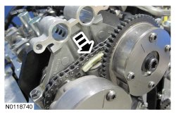 14. Assemble the 2 LH VCT (Variable Camshaft Timing) assemblies and the LH secondary timing chain.