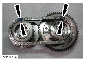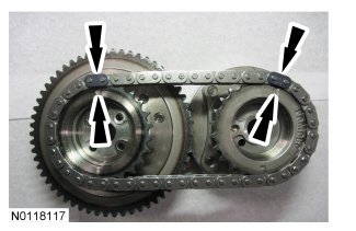 Install the primary timing chain with the colored links aligned with the timing marks on the VCT assemblies and the crankshaft sprocket.