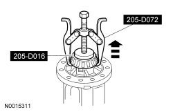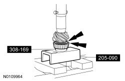 10. Using a brass drift, remove the drive pinion bearing cups by tapping alternately on opposite sides of the drive pinion bearing cups.
