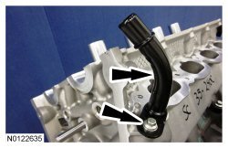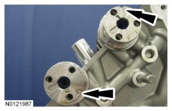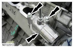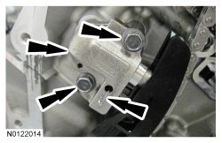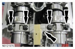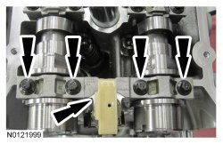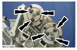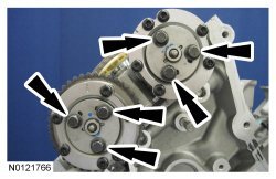 Install the 3 RH intake VCT (Variable Camshaft Timing) assembly bolts and the 3 RH exhaust VCT (Variable Camshaft Timing) assembly bolts.