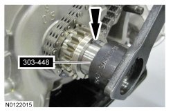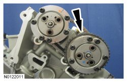 23. Install the LH VCT (Variable Camshaft Timing) assemblies and the secondary timing chain onto the LH camshafts to a position 2 mm (0.078 in) from fully seated. The timing mark on the exhaust VCT (Variable Camshaft Timing) assembly should be in the 11 o'clock position.