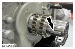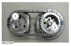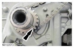 43. Install the RH VCT (Variable Camshaft Timing) assemblies and the secondary timing chain onto the RH camshafts to a position 2 mm (0.078 in) from fully seated. The timing mark on the exhaust VCT (Variable Camshaft Timing) assembly should be in the 1 o'clock position.
