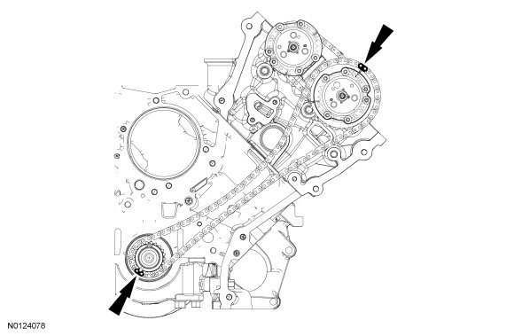 - If the secondary timing chain is not centered over the tensioner, reposition the VCT (Variable Camshaft Timing) assemblies until they are fully seated on the camshafts.