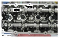 44. NOTE: It may be necessary to rotate the exhaust camshaft slightly (using a wrench on the flats of the camshaft) to seat the VCT (Variable Camshaft Timing) assemblies onto the camshafts.