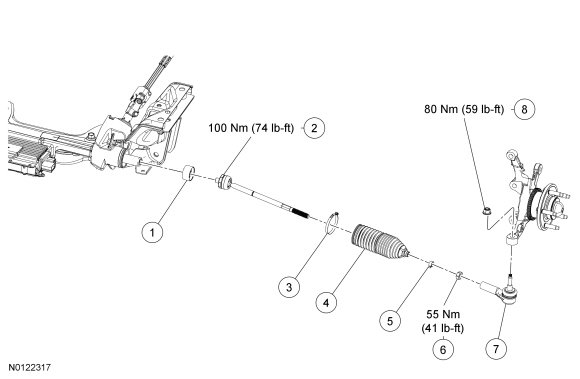 - Using a suitable crowfoot wrench, tighten the inner tie rod to 100 Nm (74 lb-ft).