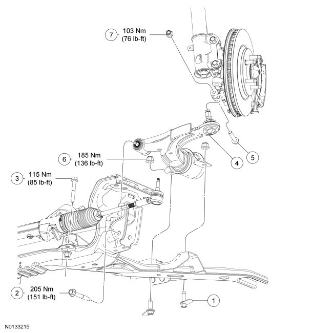 7. Tighten the new lower arm forward bolt to 205 Nm (151 lb-ft).