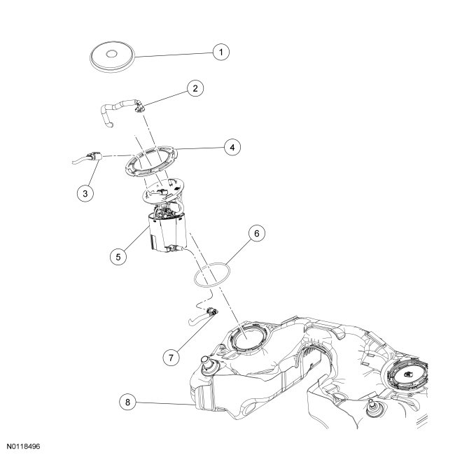 14. NOTE: Inspect the surfaces of the FP (Fuel Pump) module flange and fuel tank O-ring seal contact surfaces. Do not polish or adjust the O-ring seal contact area of the fuel tank flange or the fuel tank. Install a new FP (Fuel Pump) module or fuel tank if the O-ring seal contact area is bent, scratched or corroded.