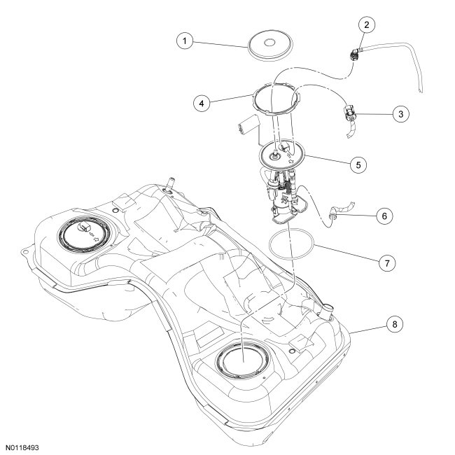 4. NOTE: This step will remove approximately one-eighth tank of fuel from a completely full fuel tank and the majority of any residual fuel from the fuel tank filler pipe. Also the fuel in the fuel tank will be below the Fuel Pump (FP) module mounting flange for FP (Fuel Pump) module removal without fuel spillage.