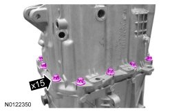 19. Remove the 15 transmission case bolts.