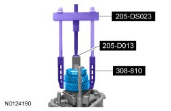 With an assistant, support the transmission case on flat surfaces of a hydraulic press. Using the Shift Rail Needle Bearing Installer and the Handle, press the countershaft out of the bearing and remove the countershaft and output shaft.