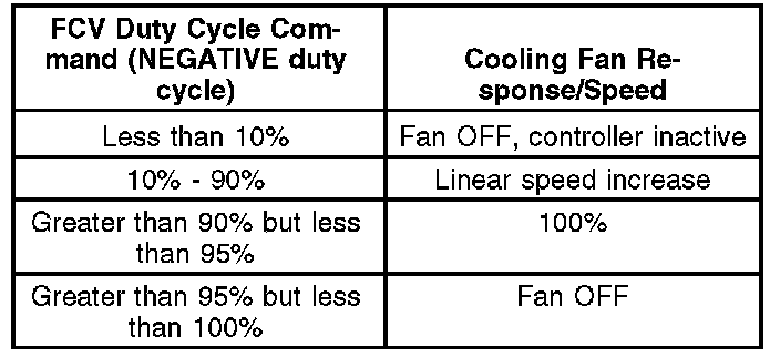 The PCM controls the fan speed and operation using a duty cycle output on the fan control variable (FCV) circuit. The fan controller (located at or integral to the engine cooling fan assembly) receives the FCV command and operates the cooling fan at the speed requested (by varying the power applied to the fan motor).