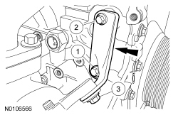 127. Install the upper RH turbocharger-to-cylinder block bracket and the 3 bolts and position the bracket as far clockwise as possible and tighten the bolts in the following sequence: