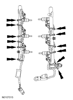 106. NOTICE: It is very important to visually inspect the routing of the wire harness to make sure that the wire harness will not be pinched or damaged between the fuel rail and the cylinder head during installation.