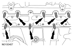 NOTICE: During engine repair procedures, cleanliness is extremely important. Any foreign material, including any material created while cleaning gasket surfaces that enters the oil passages, coolant passages or the oil pan, may cause engine failure.