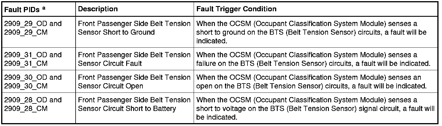 The Occupant Classification System Module (OCSM) monitors the BTS (Belt Tension Sensor) and all circuitry for faults. If a fault is detected, the OCSM (Occupant Classification System Module) will store DTC B2909 in memory and send a message to the Restraints Control Module (RCM). The RCM (Restraints Control Module) will store DTC B00A0:09 in memory and send a message to the Instrument Panel Cluster (IPC) module to illuminate the air bag warning indicator.