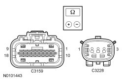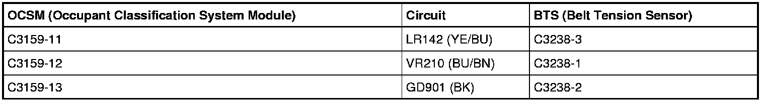 - Measure the resistance between OCSM (Occupant Classification System Module) C3159, harness side and BTS (Belt Tension Sensor) C3238, harness side using the following chart.
