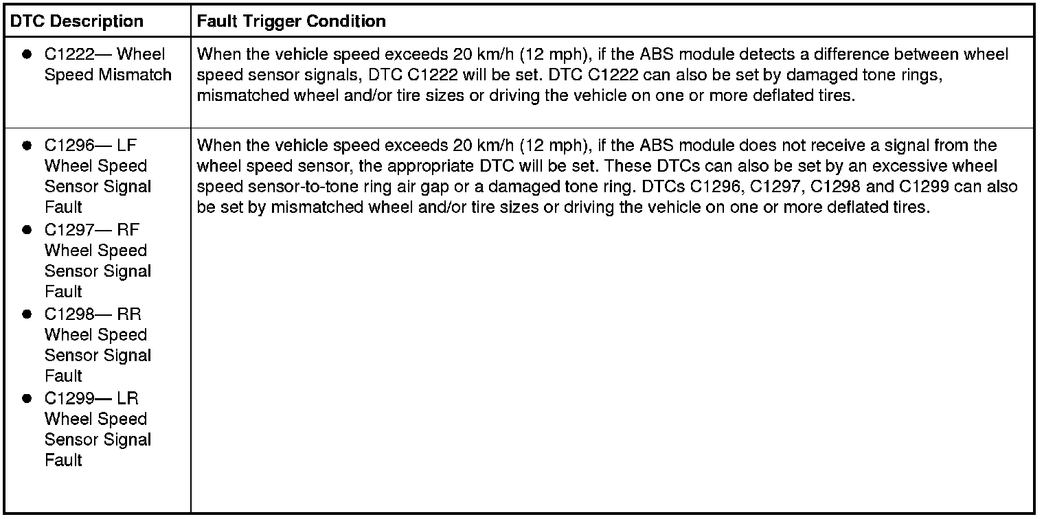 The wheel speed sensor and sensor ring generates a square wave current signal to the ABS module that is proportional to the wheel speed. The ABS module compares the wheel speed inputs from all the wheel speed sensors to determine an impending wheel lockup. Incorrect/mismatched tire size can set these DTCs as well.