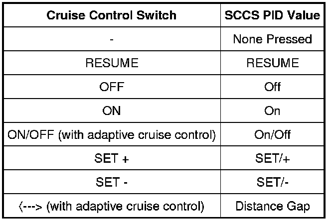 Cruise Control Switch SCCS PID Value- None Pressed RESUME RESUME OFF Off ON On ON/OFF (with adaptive cruise control) On/Off SET + SET/+ SET - SET/- 〈---> (with adaptive cruise control) Distance Gap