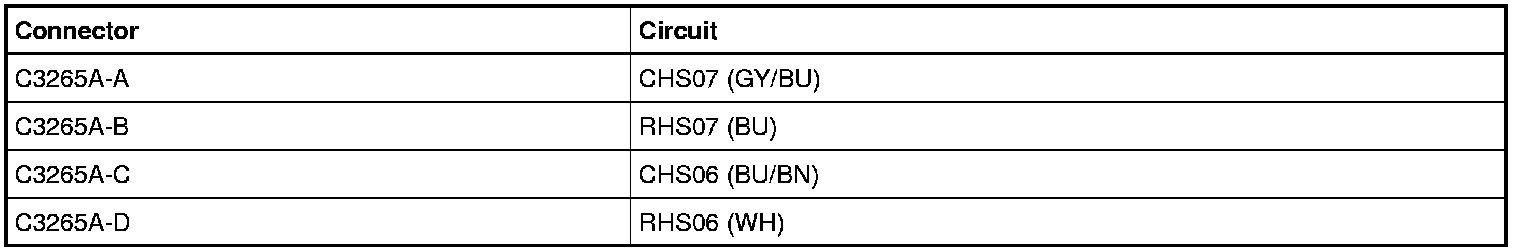 - DCSM (Dual Climate Controlled Seat Module) C3265A-C, circuit CHS06 (BU/BN), harness side and C3265A-D, circuit RHS06 (WH), harness side.