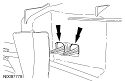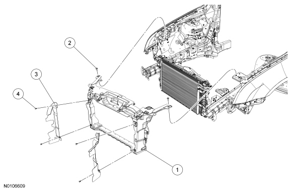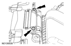 13. NOTICE: When installing the cooling module retaining clips, push the cooling module retaining clips toward the radiator grille support until the clips are properly secured and a snap is heard. Failure to properly secure the cooling module retaining clips may cause damage to the radiator or the cooling module assembly.