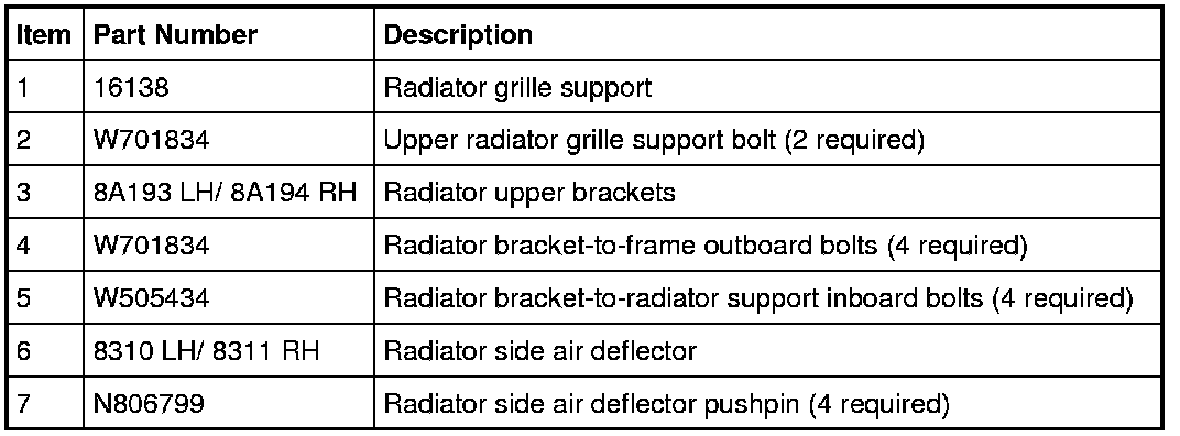 12. Remove the 4 radiator bracket-to-frame outboard bolts and the 4 radiator bracket-to-radiator support inboard bolts (4 each side).