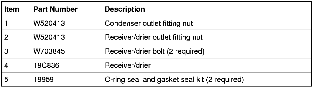 NOTE: Installation of a new receiver/drier is not required when repairing the A/C system, except when there is physical evidence of contamination from a failed A/C compressor or damage to the receiver/drier. Damage to the receiver/drier includes leaks in the receiver/drier, physical damage to the receiver/drier shell or desiccant, or moisture contamination. Moisture contamination results only from a complete loss of refrigerant and equalization of the refrigerant system pressure with atmospheric pressure for a period longer than one hour. If even a slight amount of positive refrigerant pressure is present in the system before repairs are carried out, the receiver/drier should not be replaced.