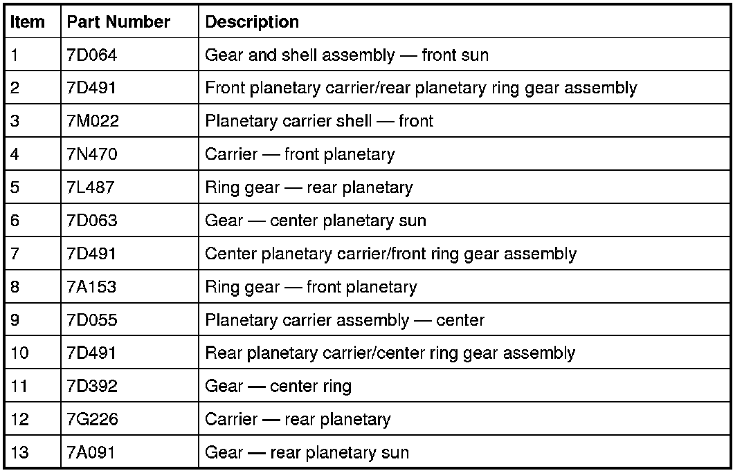 The center planetary ring gear is splined to the rear planetary carrier and transfers power from the center planetary gearset to the rear planetary gearset in 3rd gear, from the rear planetary gearset to the center planetary gearset in 4th gear and is held stationary by the low One-Way Clutch (OWC) and low/reverse clutch in 1st gear and reverse.