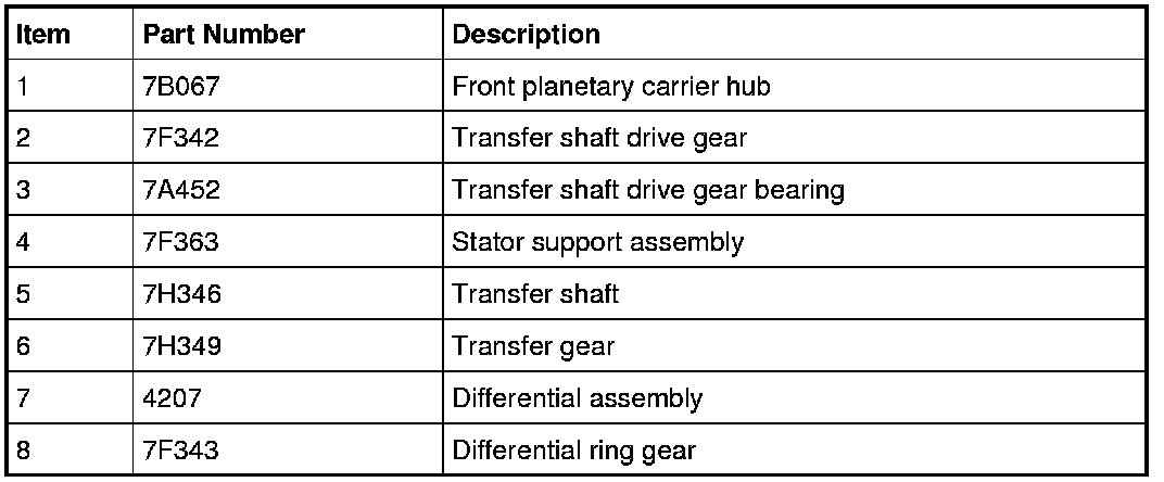 The planetary gear set transfers power to the transfer shaft drive gear through the front planetary carrier hub. The transfer shaft drive gear is part of the stator support assembly. The transfer shaft drive gear turns the transfer shaft and gear assembly which multiplies torque through gear reduction and turns the differential ring gear.