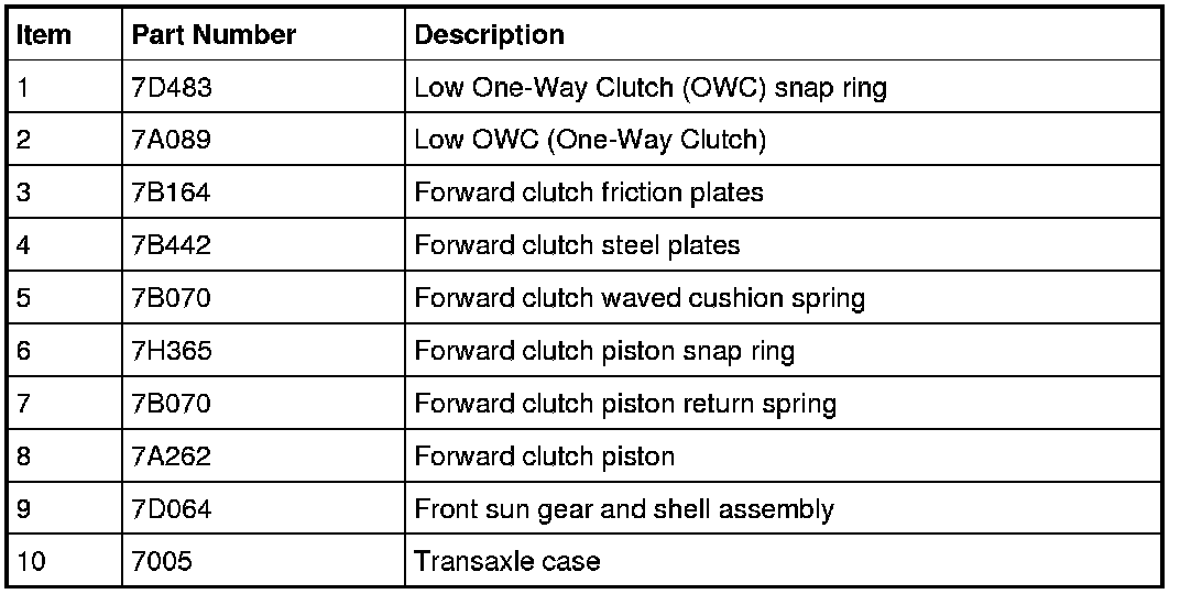 The forward clutch is a brake clutch that holds the front sun gear and shell assembly. The forward clutch is applied in 1st, 2nd, 3rd and 4th gear.