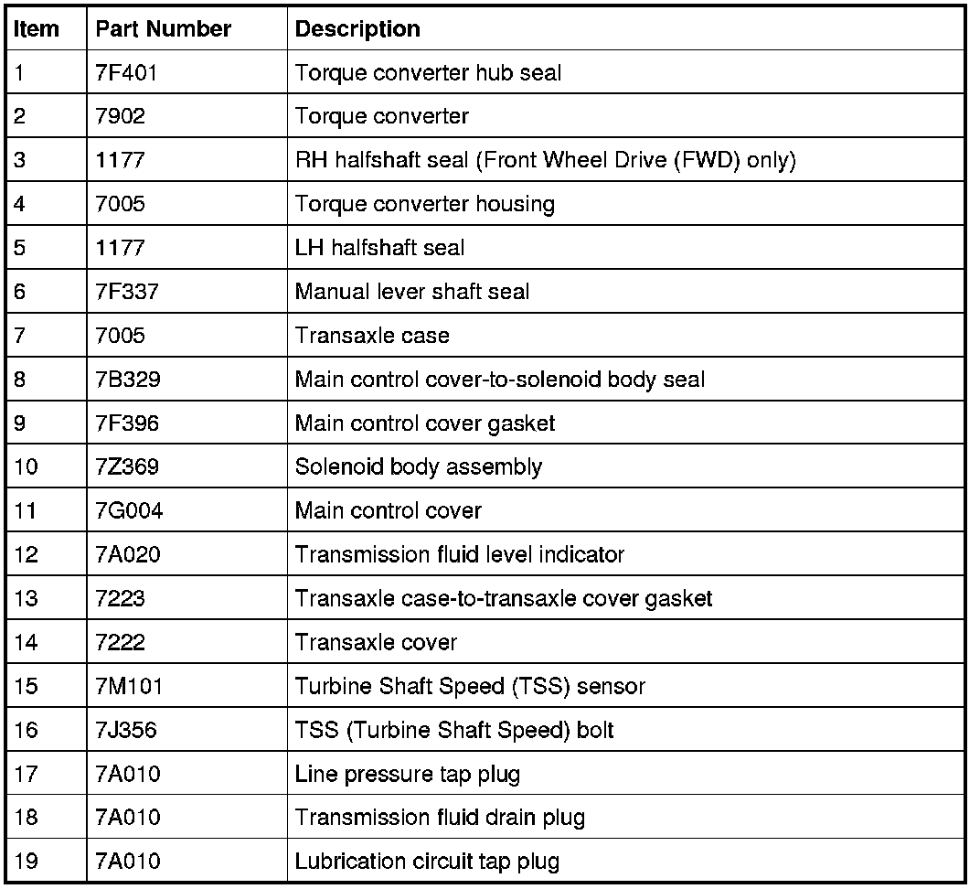 The torque converter housing has a lip-type seal that seals the torque converter hub. The manual lever shaft and halfshafts also use lip-type seals. AWD (All-Wheel Drive) vehicles do not use a RH halfshaft seal, the transaxle is sealed by the PTU (Power Transfer Unit) on the RH side.