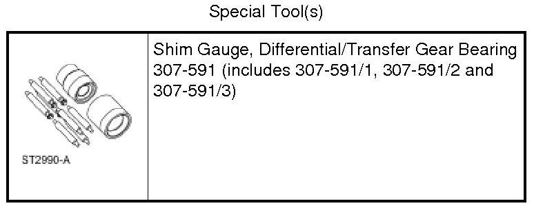 14. Remove the Differential/Transfer Gear Bearing Shim Gauge 307-591/1 and 307-591/2 from the differential and transfer shaft assemblies.