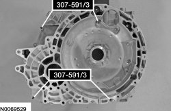 3. Install the Differential/Transfer Gear Bearing Shim Gauge 307-591/3 (studs) in the transaxle case to align the torque converter housing.