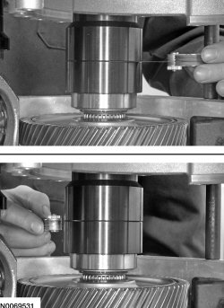 4. NOTE: Make sure that the silicone has been cleaned off the machined surface of the transaxle case and the torque converter housing before installing the Differential/Transfer Gear Bearing Shim Gauge 307-591/3 (4 spacers) or the preload measurement may be inaccurate.