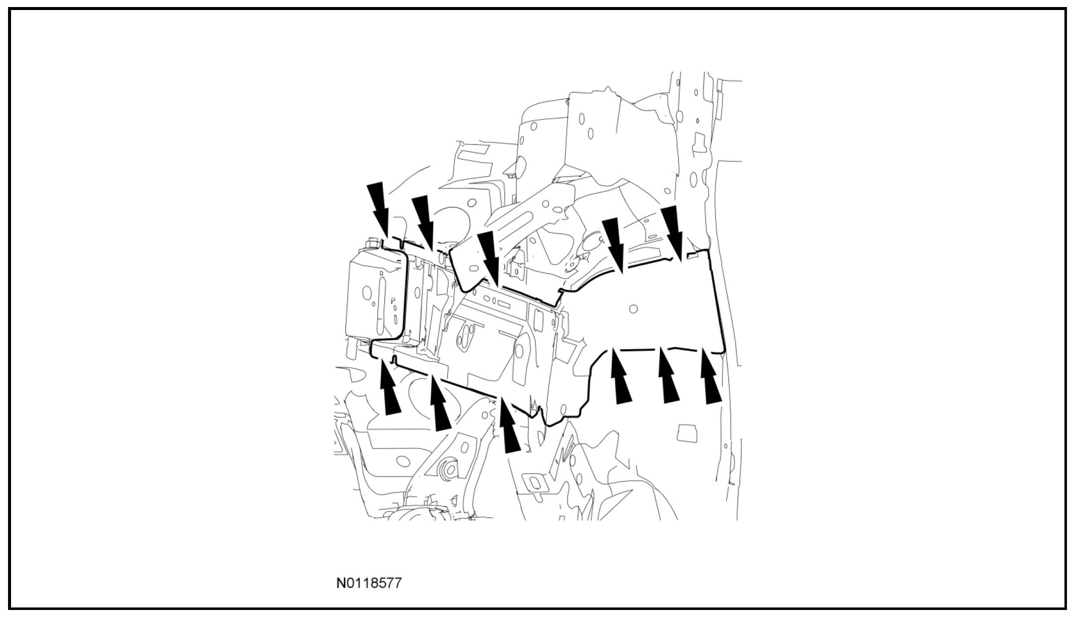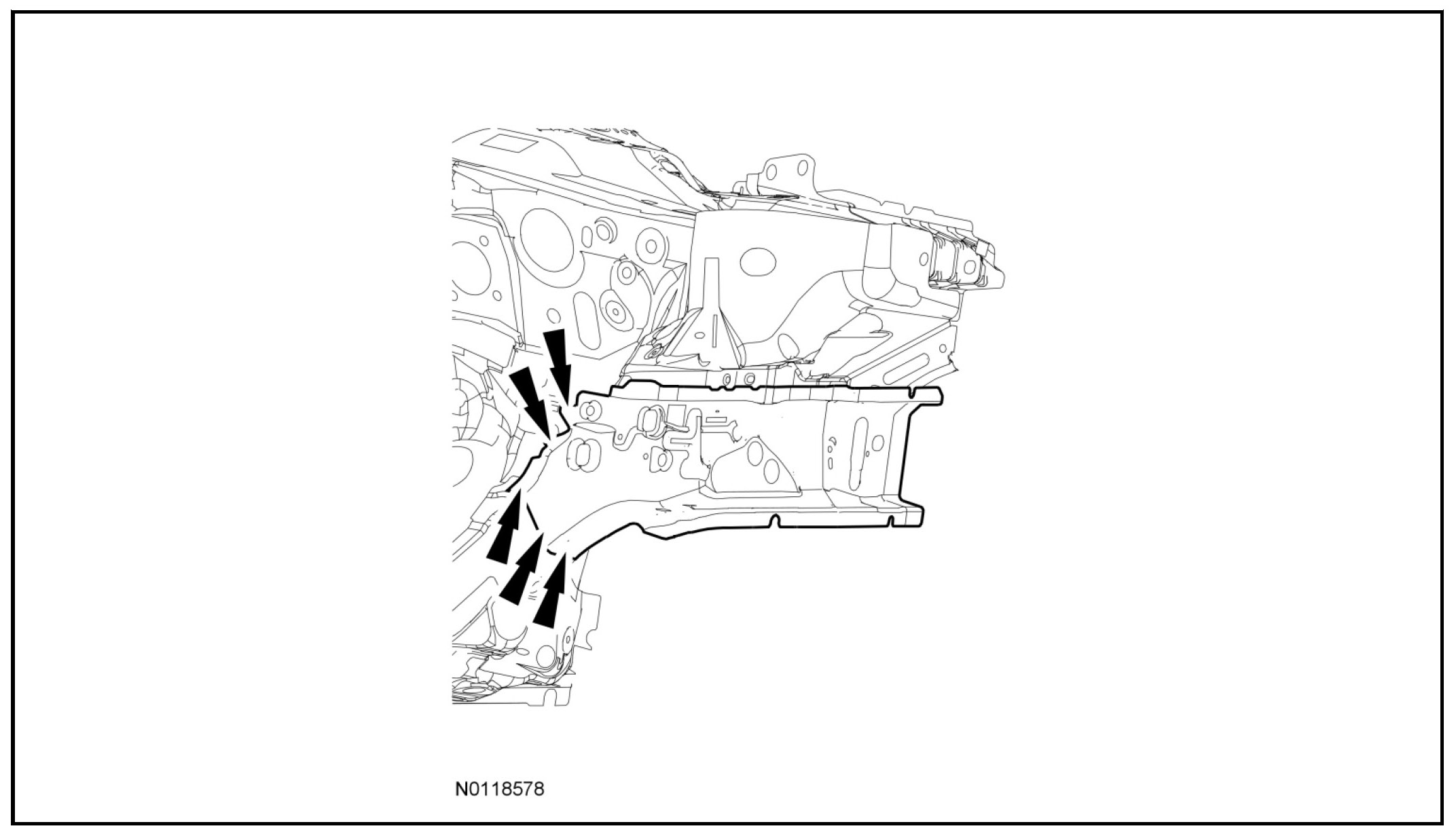 NOTICE: A frame rail sectioning kit is not available for this vehicle. Frame rail replacement must be done at the factory seams. Failure to follow this direction will result in an incorrect repair and vehicle energy management will be compromised.
