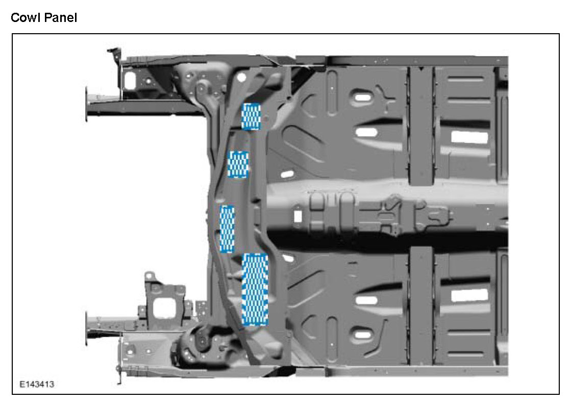 NOTE: The following illustration serves as a reference to indicate mastic patch (butyl) locations. Additional insulators and sound deadeners are used beyond those indicated in the illustration.