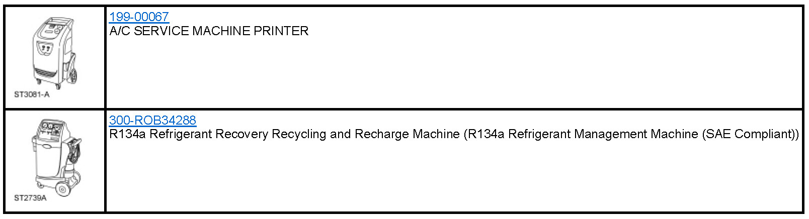 Special Tool(s): 199-00067 (A/C SERVICE MACHINE PRINTER), 300-ROB34288 (R134a Refrigerant Recovery Recycling and Recharge Machine (R134a Refrigerant Management Machine (SAE Compliant)))