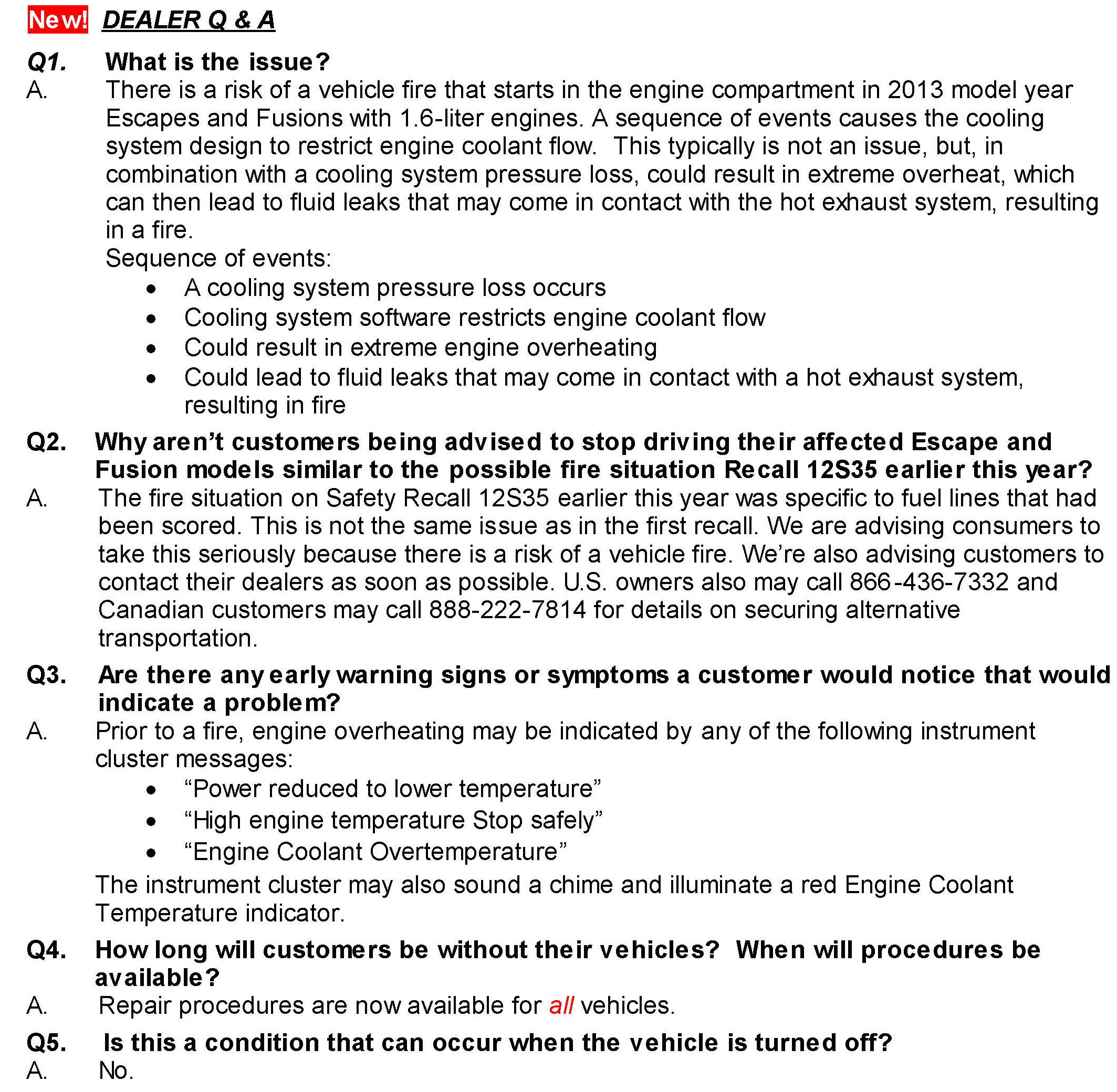 Recall - Engine Overheating, Potential Engine Compartment Fires