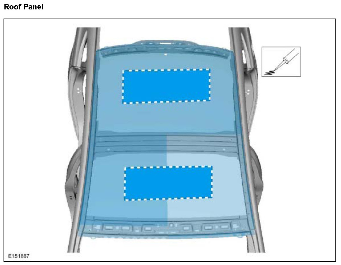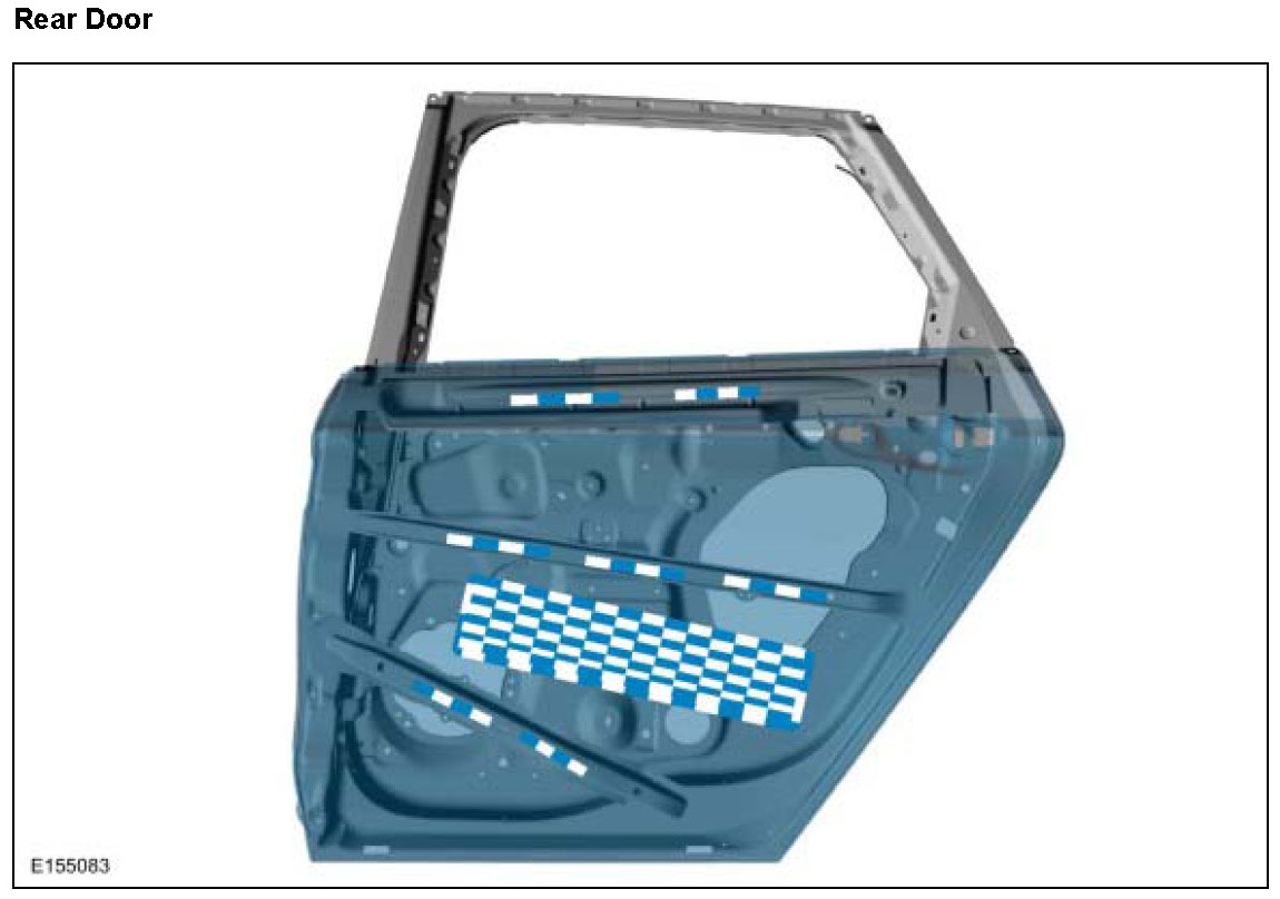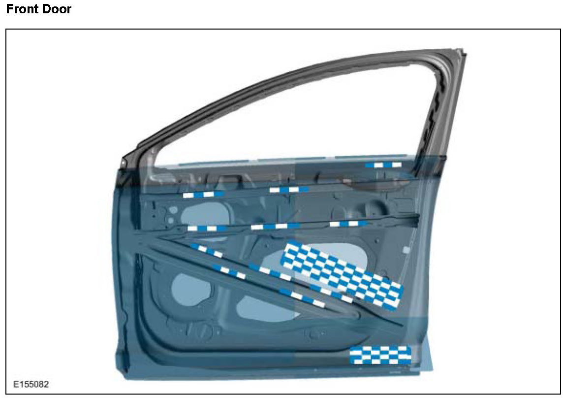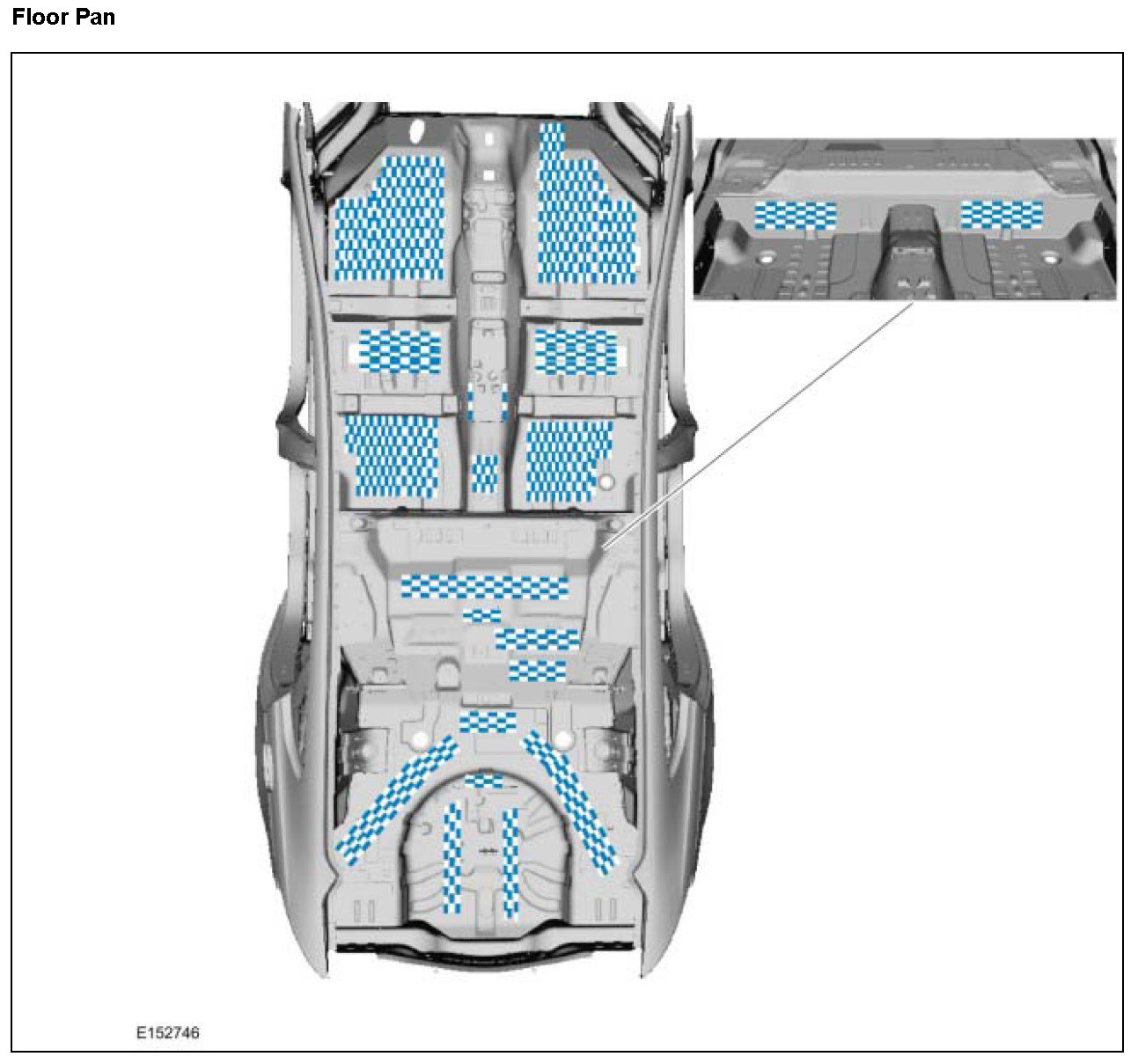 NOTE: The following illustrations serve as a reference to indicate mastic patch (butyl) locations. Additional insulators and sound deadeners are used beyond those indicated in these illustrations.