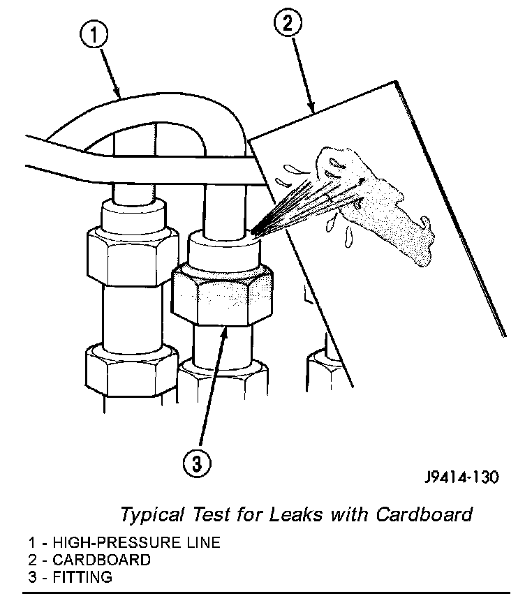 WARNING: DUE TO EXTREME FUEL PRESSURES, USE EXTREME CAUTION WHEN INSPECTING FOR HIGH-PRESSURE FUEL LEAKS. DO NOT GET YOUR HAND NEAR A SUSPECTED LEAK. INSPECT FOR HIGH-PRESSURE FUEL LEAKS WITH A SHEET OF CARDBOARD. HIGH FUEL INJECTION PRESSURE CAN CAUSE PERSONAL INJURY IF CONTACT IS MADE WITH THE SKIN.