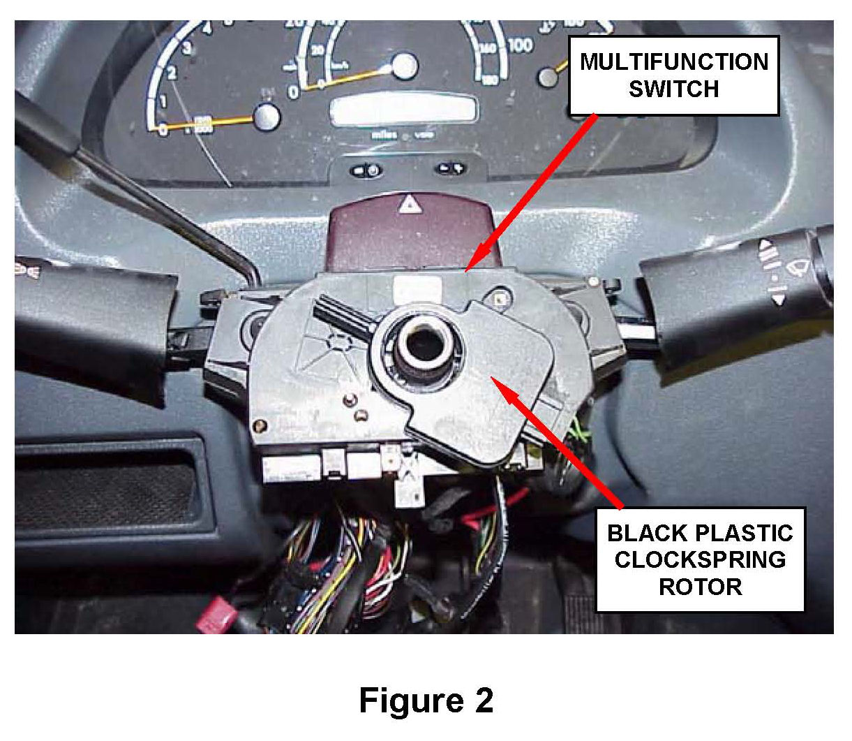 14. Remove the two multifunction switch retaining screws, disconnect the electrical connectors and remove the multifunction switch (Figure 2).